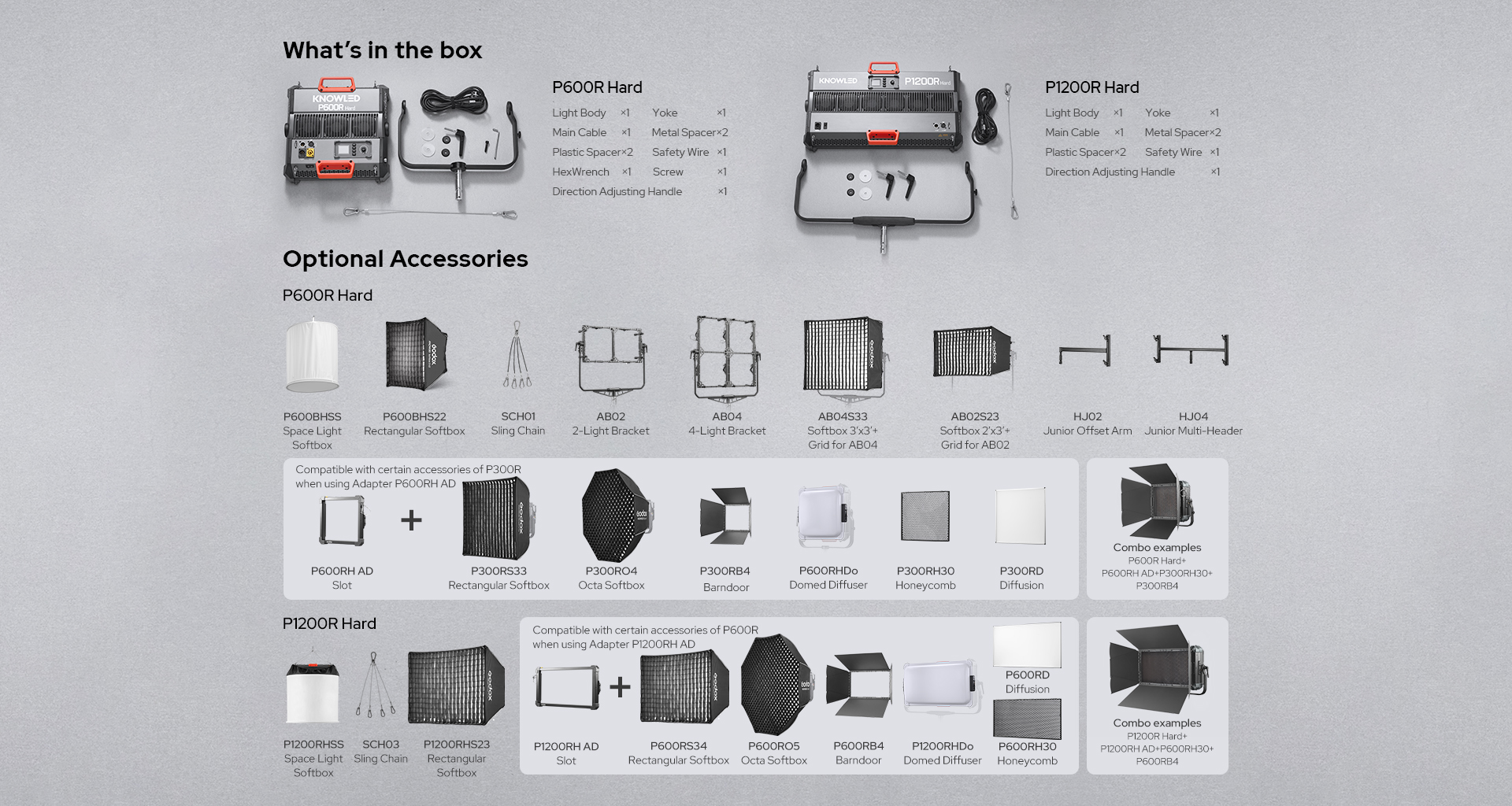The P600R Hard/P1200R Hard offers a versatile accessory range, enhancing lighting efficiency for diverse needs in complex on-set environments.