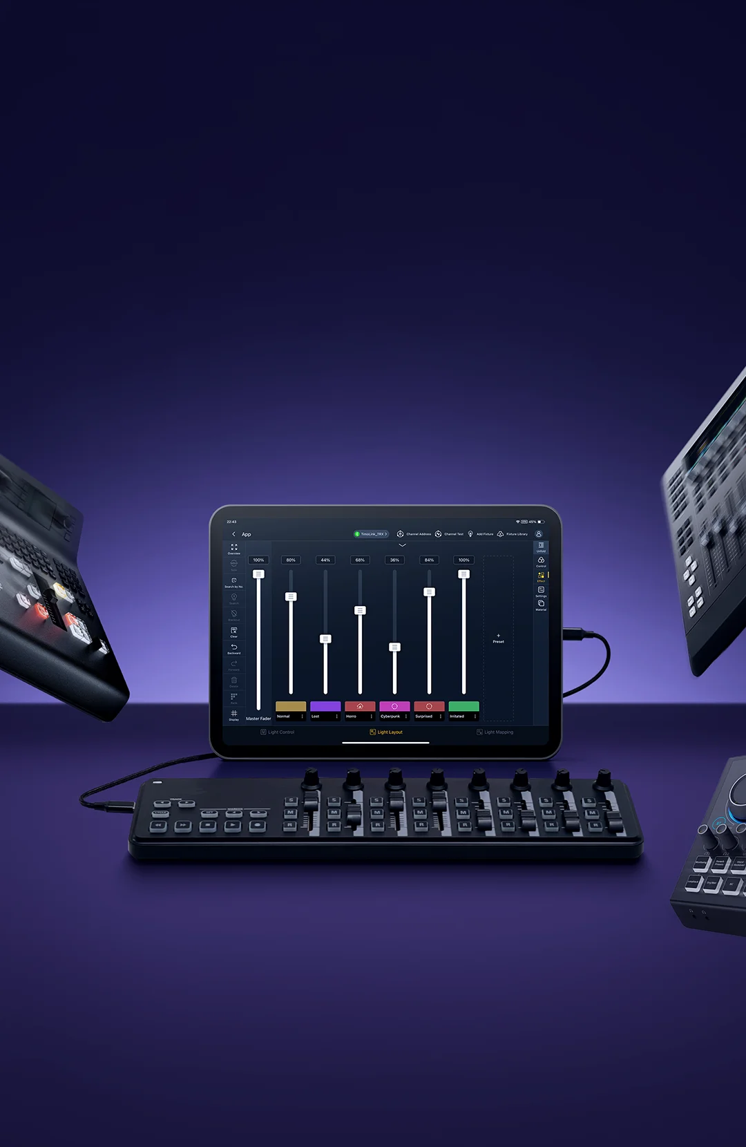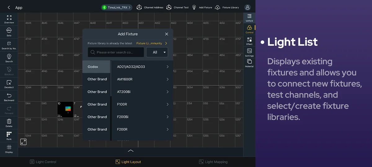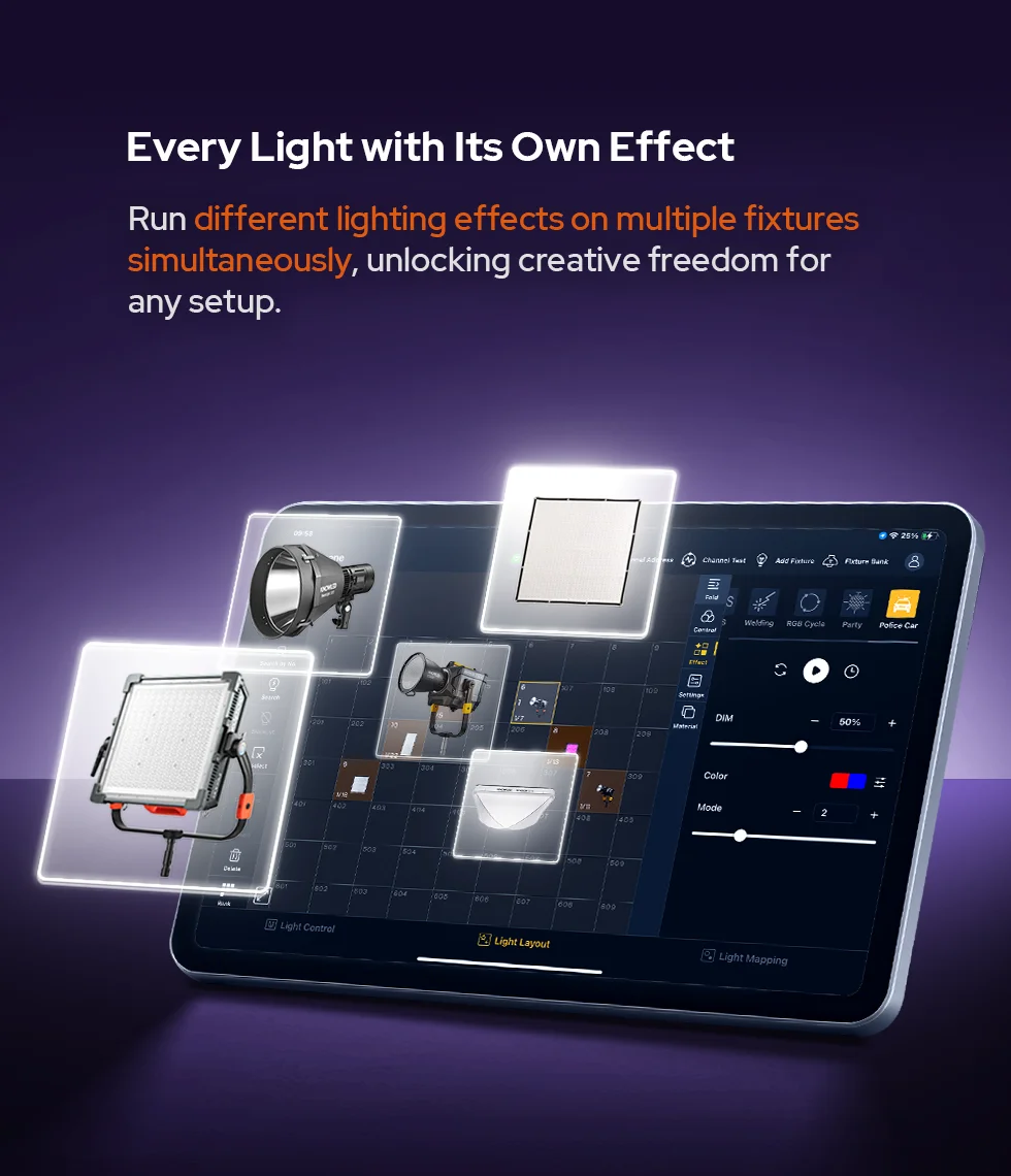 Godox KNOWLED APP, a professional lighting control tablet app, streamlines lighting workflows. Designed for large-scale lighting setups, its fixture layout interface, integrated MIDI support and mapping features enable flexible, precise adjustments--where every creative moments is free to unfold.