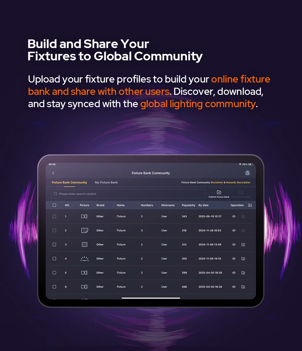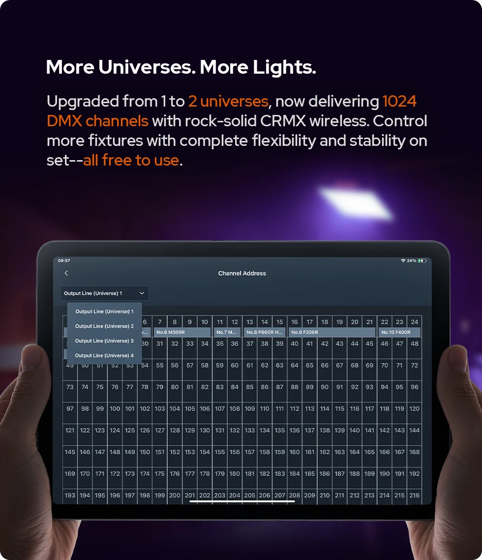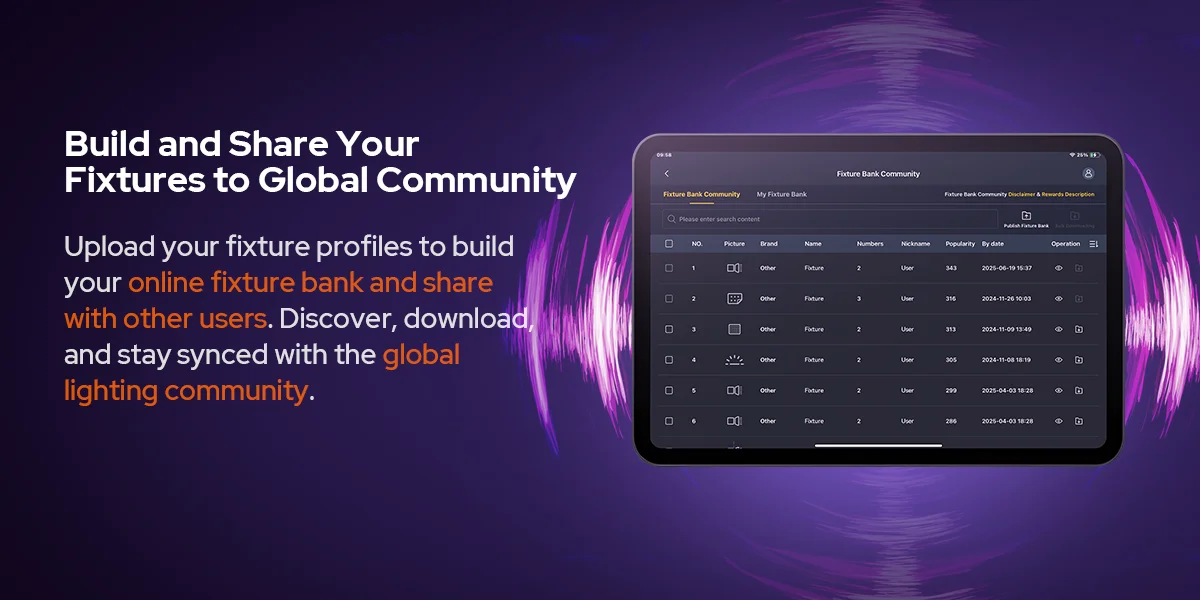 Upgrading to 2 universes and 1,024 channels, each light can run its own effect with enhanced FX options for richer visual expression. Save and share fixtures through a global community. Collaborate with team via QR codes to transfer setups—from creation to collaboration, made effortless.