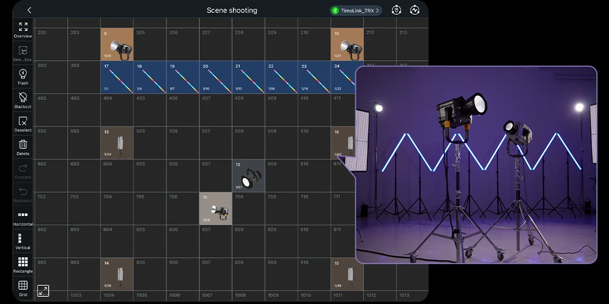 With the Godox KNOWLED app, you can easily position fixtures on the grid to match your on-set lighting setup. This provides a crystal-clear view of all fixture positions and statuses, making it highly intuitive. It streamlines your creative work and boosts efficiency.