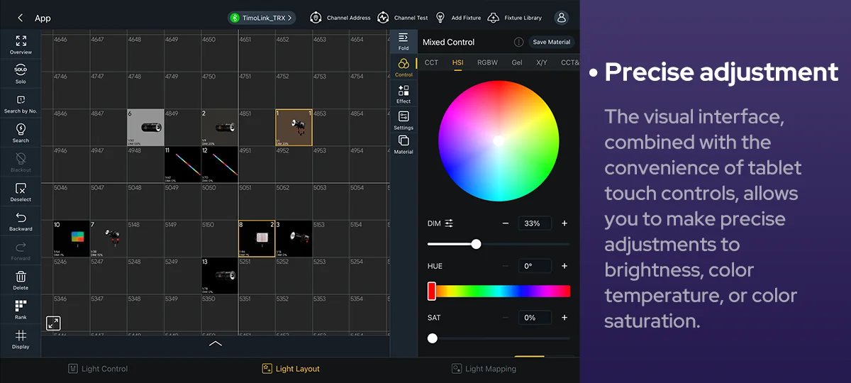 The visual interface, combined with the convenience of tablet touch controls, allows you to make precise adjustments to brightness, color temperature, or color saturation using an intuitive graphical interface. This ensures you achieve the exact desired effect.