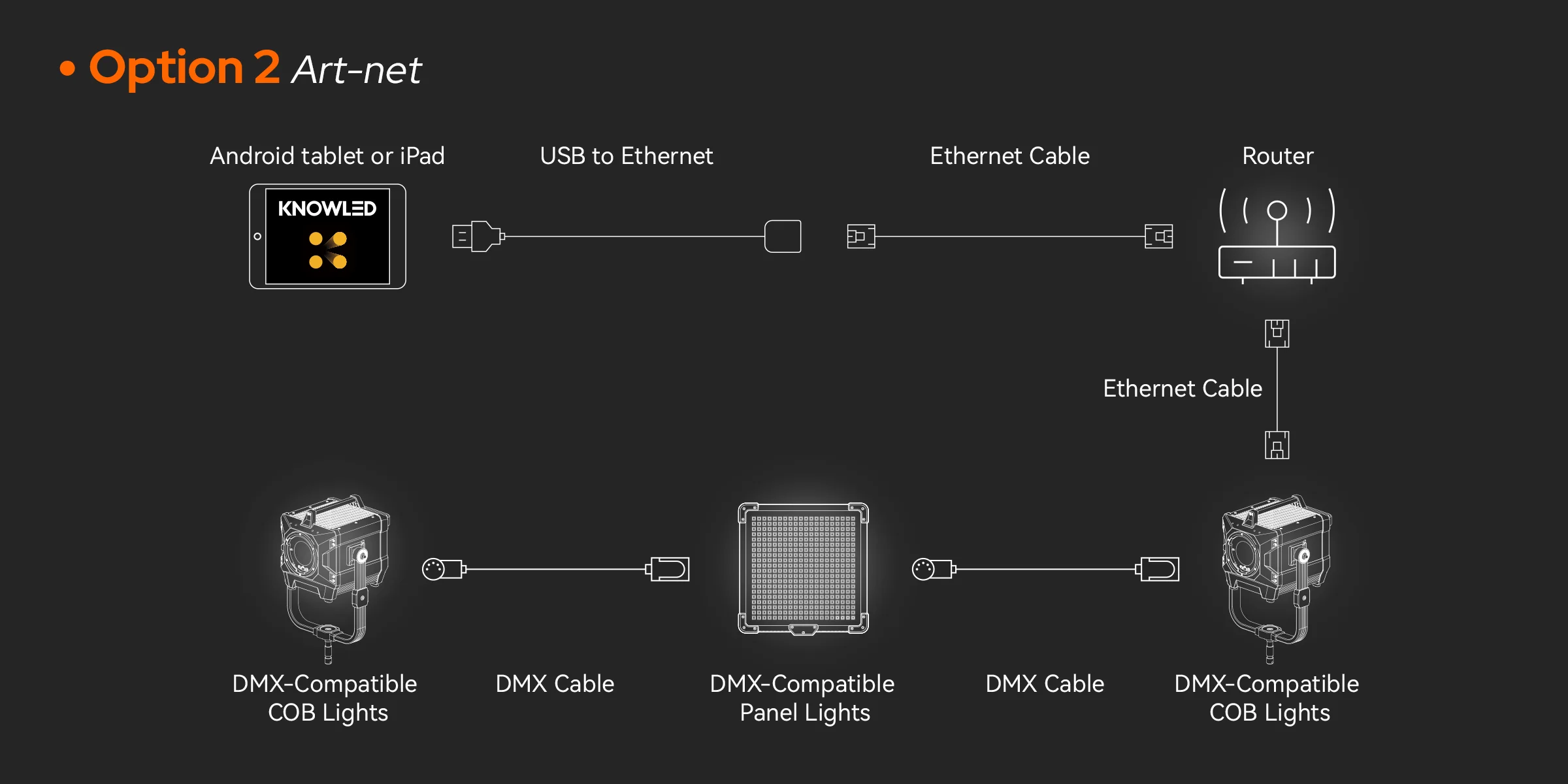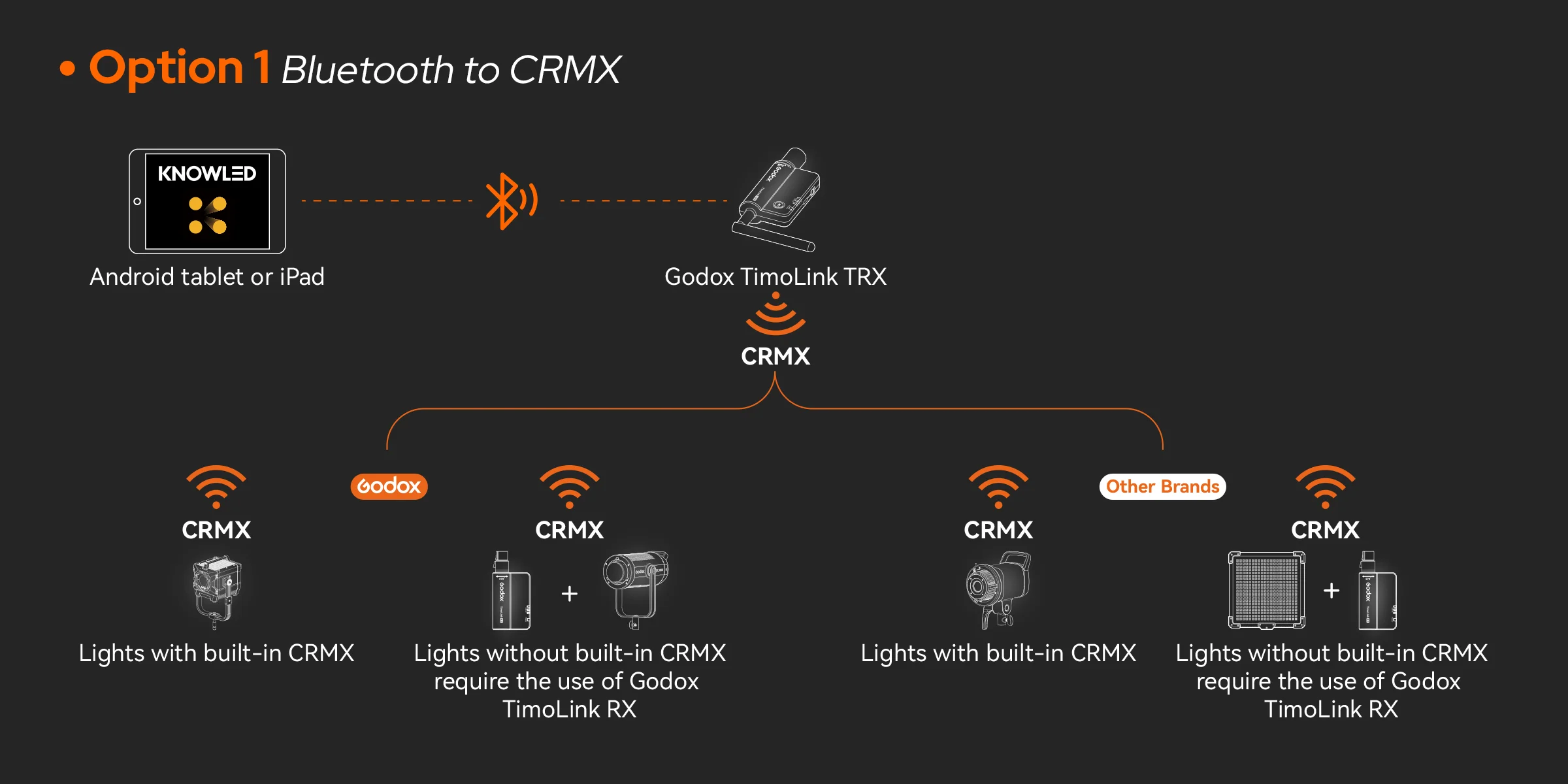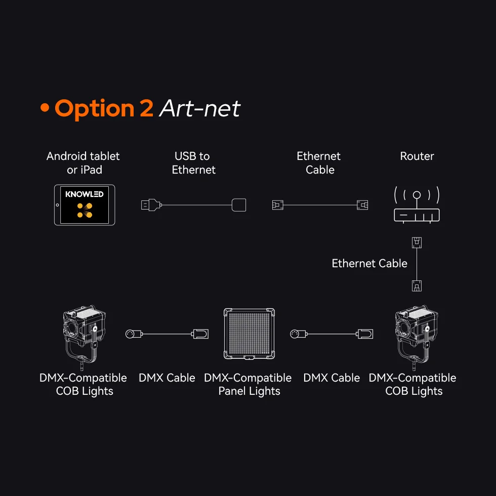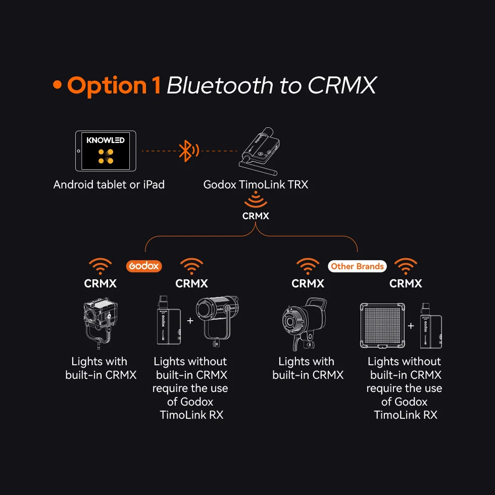 Godox KNOWLED app provides two connectivity options: Bluetooth to CRMX and Ethernet Art-Net, giving you the flexibility to choose based on your specific requirements.